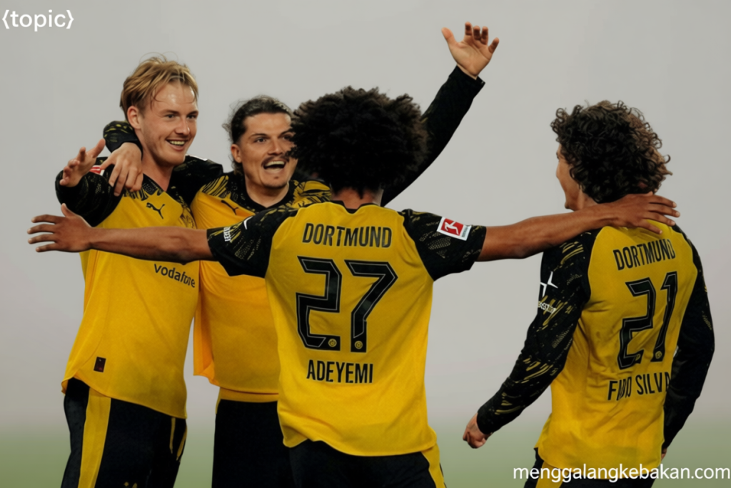 Jakarta – Borussia Dortmund mengakhiri laga Bundesliga melawan Stuttgart dengan kemenangan dramatis 2-0 di MHPArena pada Minggu dini hari WIB. Dua gol penentu tercipta di masa injury time, dihasilkan oleh Karim Adeyemi dan Julian Brandt, yang masing-masing masuk sebagai pemain pengganti. Kemenangan ini membantu Dortmund tetap berada di peringkat kedua klasemen dengan 64 poin, tertinggal sembilan angka dari Bayern Munich yang menduduki puncak.